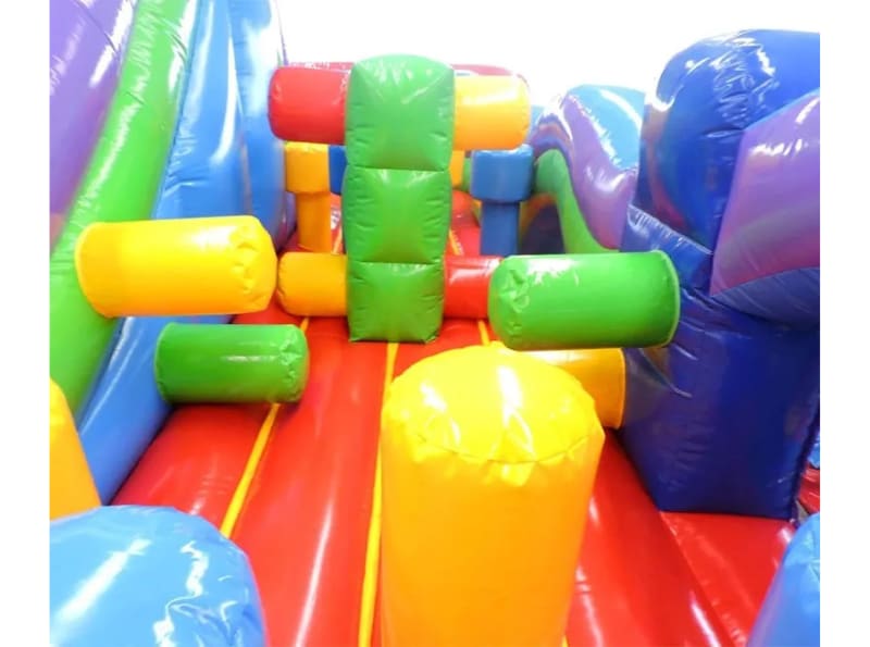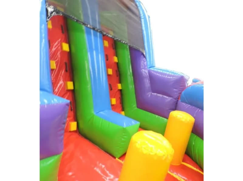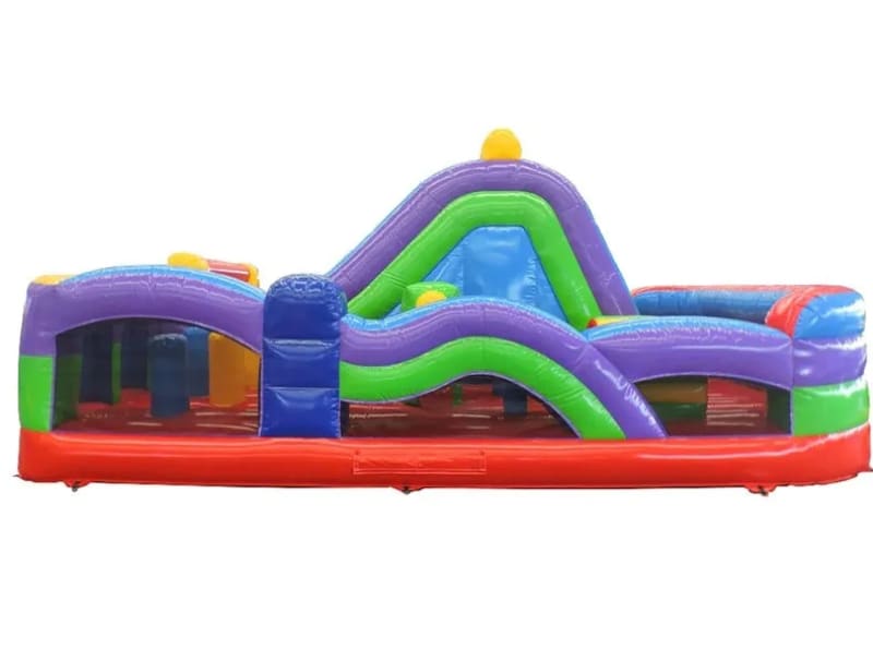 Race, crawl, climb, and slide on the Radical Run Obstacle Course. This 30' Radical Run Obstacle Course delivers nonstop excitement for kids, teens, and adults. Bright retro colors and a compact footprint make it ideal for parties, school events, and community festivals. The layout keeps traffic moving with the entrance and exit in the same spot for safe, continuous fun. 🚀