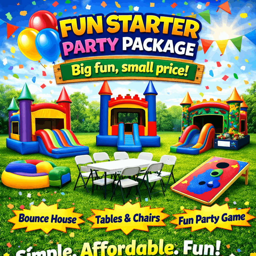 The Fun Starter Party Pack gives you big fun without the big price tag. Perfect for backyard birthdays, family gatherings, and casual neighborhood parties. This ready-to-book bundle includes a choice of our popular bounce houses, tables, chairs, and an interactive yard game. Easy setup. Fast delivery. Big smiles. 😊